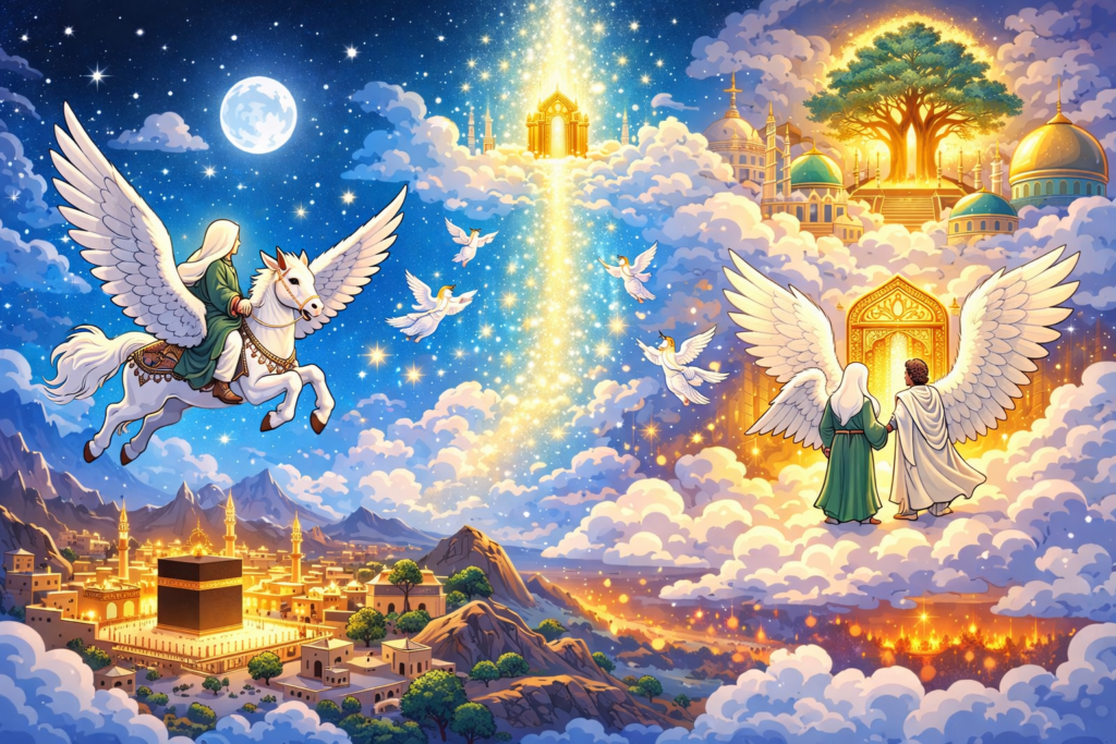 Dalam perjalanan ini, Nabi Muhammad ﷺ mendapatkan petunjuk, kewajiban shalat lima waktu, dan pelajaran tentang kehidupan dan iman. Kisah ini menjadi simbol perjalanan spiritual yang memerlukan niat tulus, fokus, dan kesabaran nilai yang bisa kita tiru dalam ibadah sehari-hari.